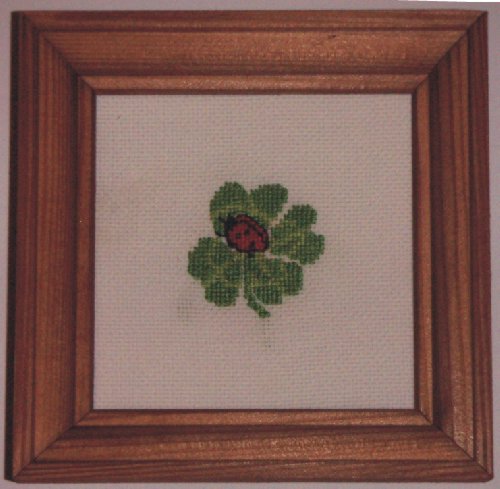 Vyšitý obrázek křížkovým stehem na kanavě (8x8cm) v dřevěném rámečku se sklem (rozměr s rámečkem 11x11cm).