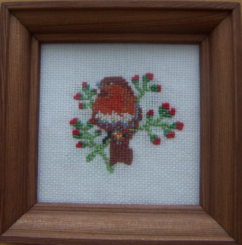 Vyšitý obrázek křížkovým stehem na kanavě (8x8cm) v dřevěném rámečku se sklem (rozměr s rámečkem 11x11cm).