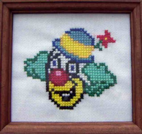 Vyšitý obrázek křížkovým stehem na kanavě - rozměr výšivky 13 x 12 cm. Výšivka je v dřevěném rámečku hnědé barvy se sklem (celkový rozměr rámečku je 15,8 x 14,6 cm).
