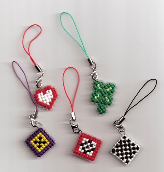 Předlohy na přívěsky na mobil - vyšívá se na plastovou kanavu. Balení obsahuje vše potřebné na vyšití 5 ks přívěsků - plastovou kanavu, potřebné bavlnky, jehlu, barevný rozkres, poutka na pověšení