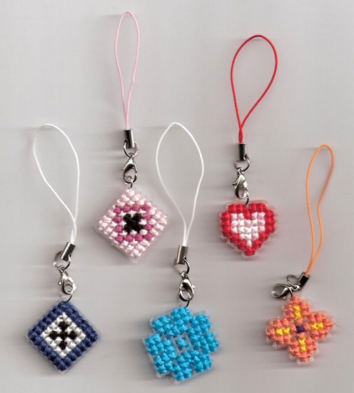 Předlohy na přívěsky na mobil - vyšívá se na plastovou kanavu. Balení obsahuje vše potřebné na vyšití 5 ks přívěsků - plastovou kanavu, potřebné bavlnky, jehlu, barevný rozkres, poutka na pověšení