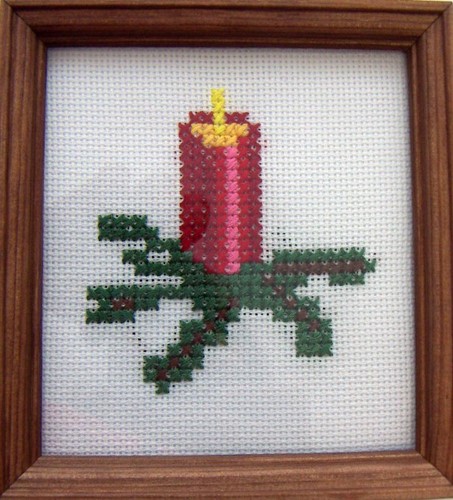 Vyšitý obrázek křížkovým stehem na kanavě - rozměr výšivky 12 x 13 cm. Výšivka je v dřevěném rámečku hnědé barvy se sklem (celkový rozměr rámečku je 14,6 x 15,8 cm).